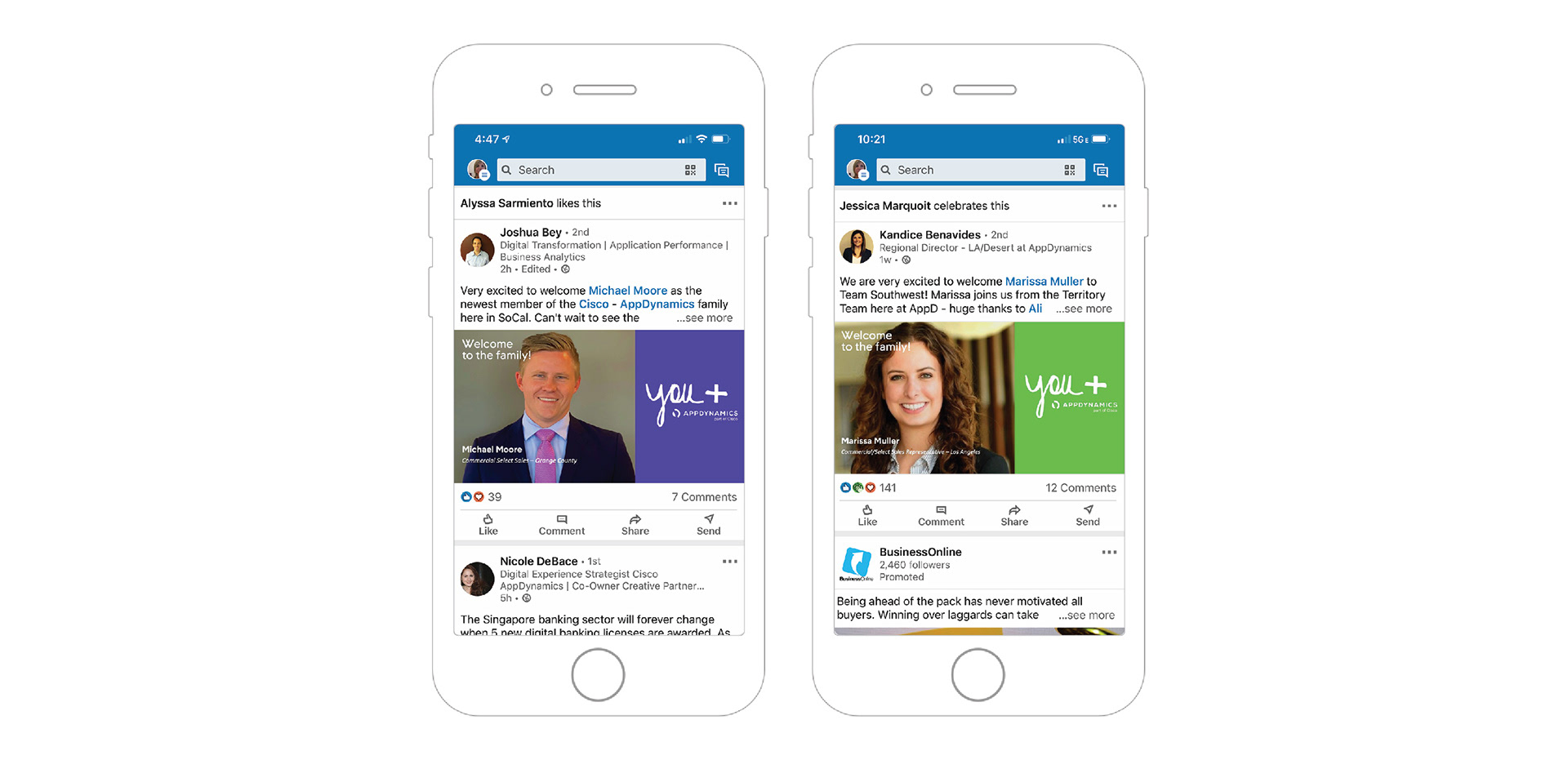 As the first phase of the campaign, social posts were designed to drive awareness and attract a diverse pool of qualified applicants. A series of LinkedIn assets enabled hiring managers to easily share open positions, directing candidates to the AppDynamics website to learn more about the company and explore open roles.